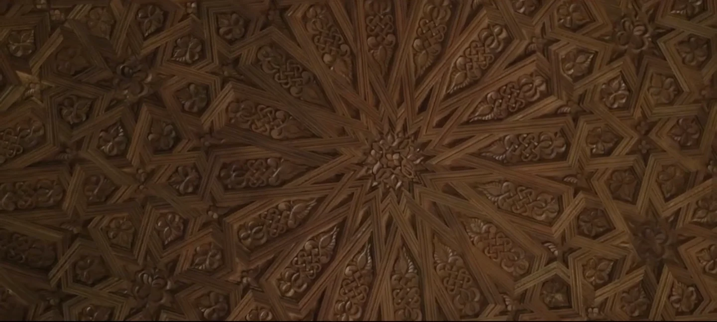 "سقف من خشب الأرز المنحوت يدويًا، مستوحى من المقرنصات الأندلسية، مصنوع في الرباط لفيلا خاصة في مسقط."